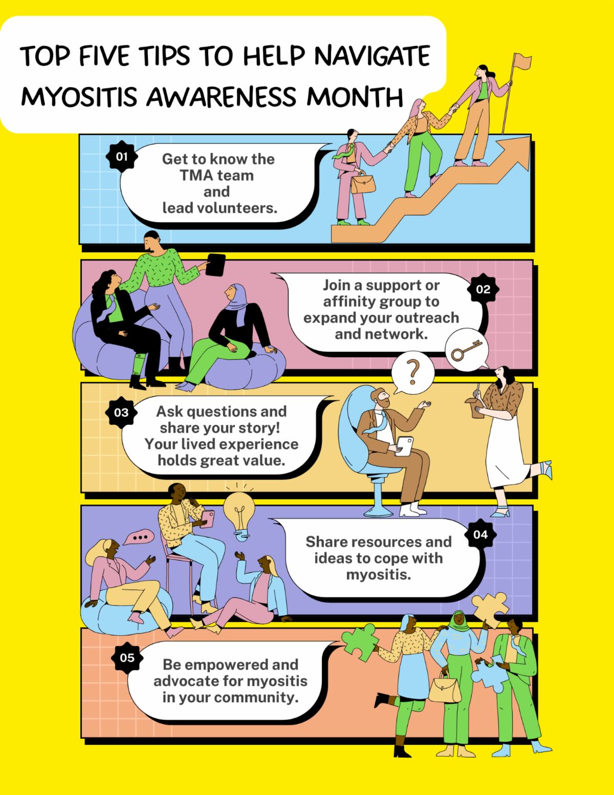 Through your social network, you can show your support and spread the word. Use TMA’s social media graphics to feature Myositis Awareness Month on your own social media!