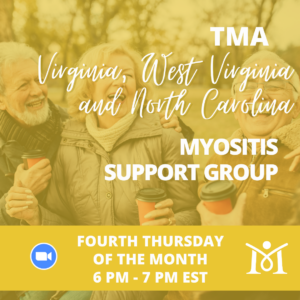 The TMA VA, WV, NC Northeast Myositis Support Group meets on the fourth Thursday of each month at 6:00 PM ET, offering a space for individuals living with myositis to connect, share their experiences, and find support. Whether you’re newly diagnosed or have been managing myositis for years, this group provides a supportive community where you can learn from others, gain helpful resources, and offer encouragement.