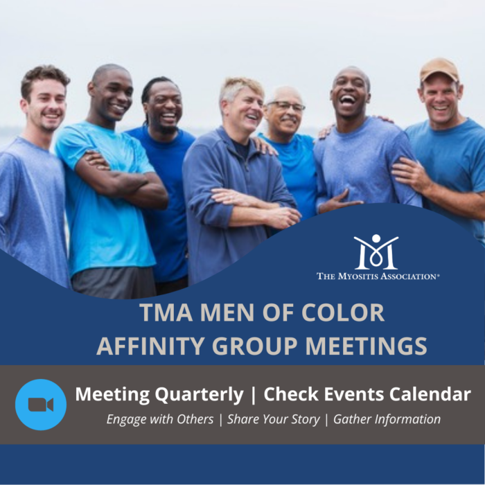 TMA is excited to announce our newest virtual offering: TMA Men of Color Affinity Group. Thanks to the initiative of TMA’s Women of Color Affinity Group in getting this off the ground, this new group will meet quarterly as a way for men of color who are living with myositis to connect, share their stories, and learn more about myositis and how they can navigate the challenges of chronic disease. This group meets quarterly, see calendar.